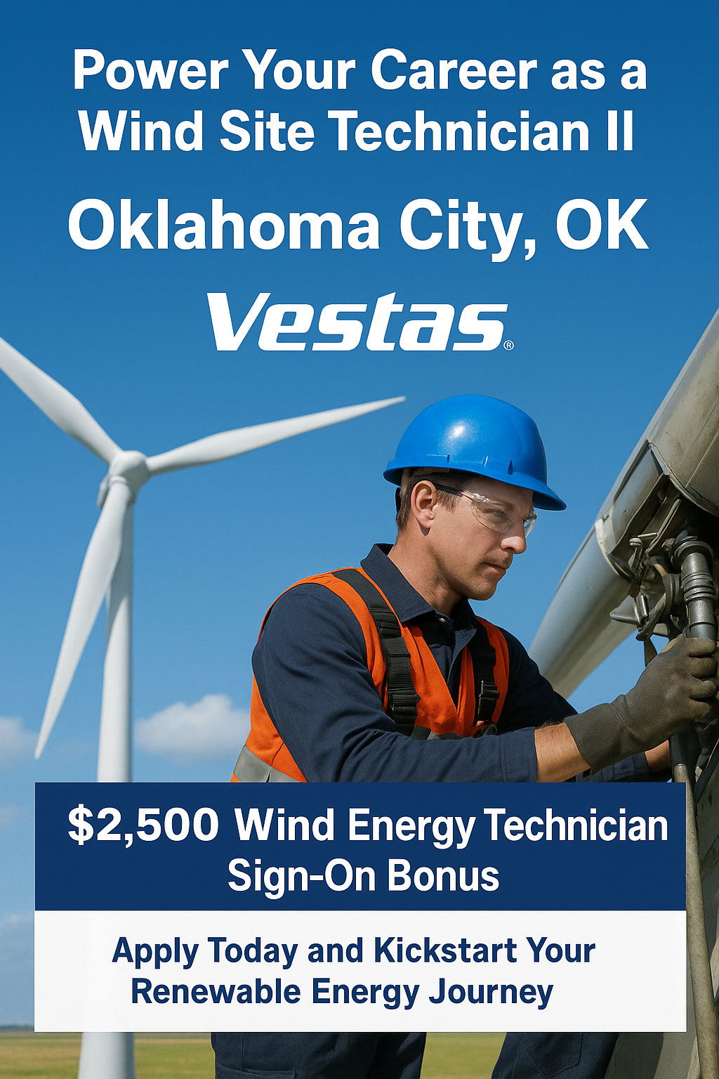 Are you ready to power the future of renewable energy? Vestas, the world leader in sustainable wind solutions, is hiring a Wind Site Technician II in Oklahoma City, OK. This role offers a $2,500 sign-on bonus, competitive pay, full benefits, and an opportunity to grow your career in wind turbine maintenance and operations.